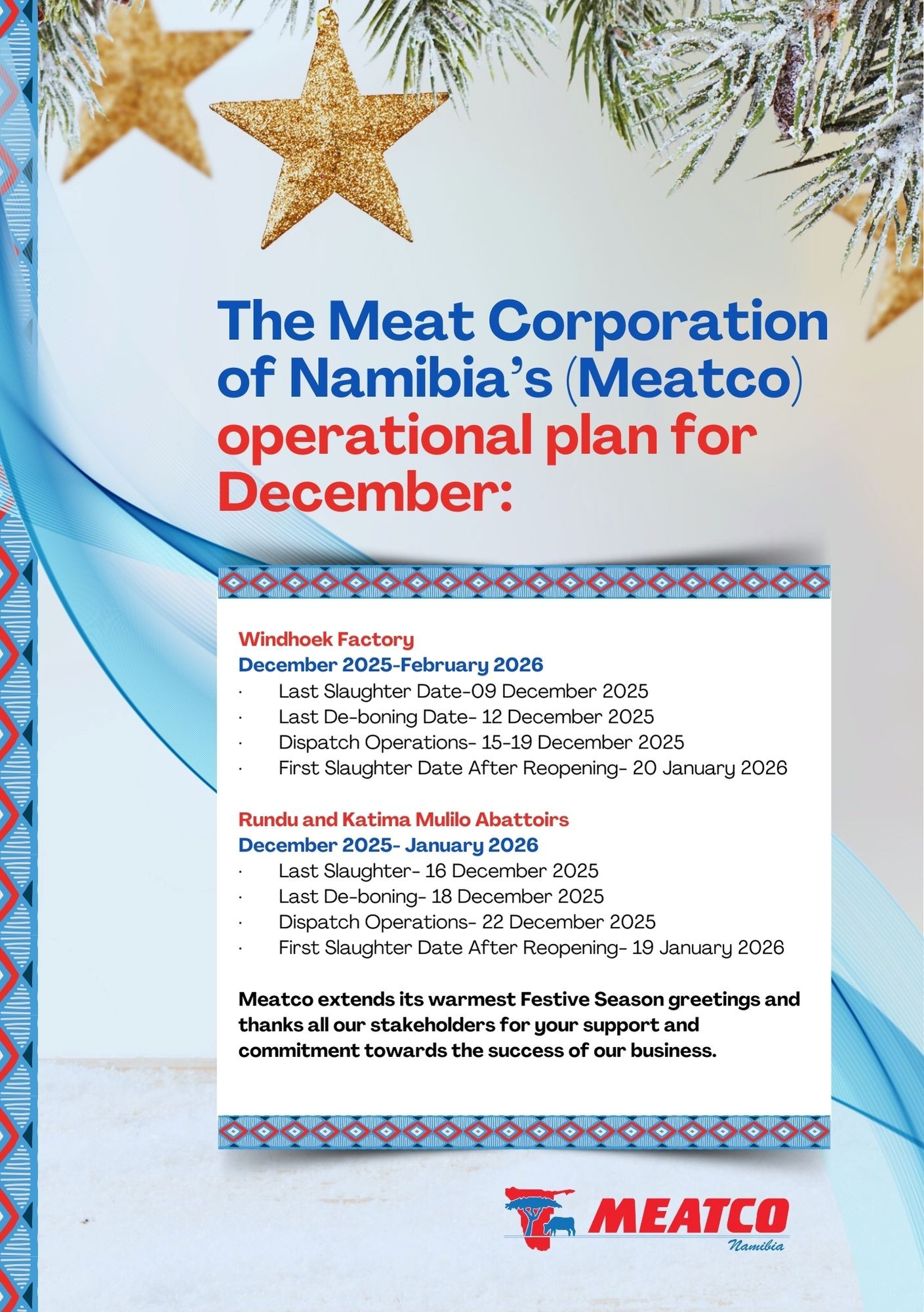 The Meat Corporation of Namibia (Meatco) was established and is regulated by the Meat Corporation of Namibia Act (Act 1 of 2001), hereafter referred to as the Meatco Act. As per the Act, the mandate of the Corporation is to serve, promote, and coordinate the interests of livestock producers in Namibia, while striving for the stabilisation of the red meat industry of Namibia, not least as both of these are of national importance.