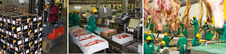 Our Agro-processing Operations consist of different sections where animals are slaughtered and processed into meat products. Employees are assigned to specific workstations and the carcasses move on a conveyor system from station to station until the slaughter and processing process is completed.